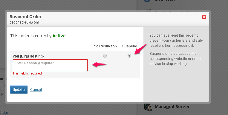 ii. Select the Suspend radio button, enter a reason for suspension and click on update.