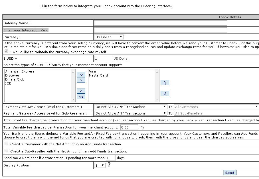 - Total Fixed fee charged per transaction for your merchant account (Per Transaction Fixed Fee charged by your Bank + Per Transaction Fixed Fee charged byEbanx): Your bank andEbanx may charge a fixed fee per transaction, if you choose to pass on this fee to your customers and sub-resellers then you can set the amount in this field