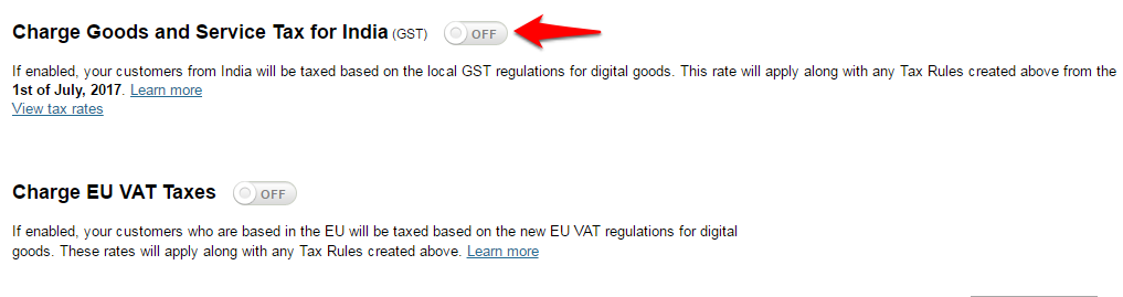 Click on the ON / OFF toggle next to Charge Goods and Service Tax for India.