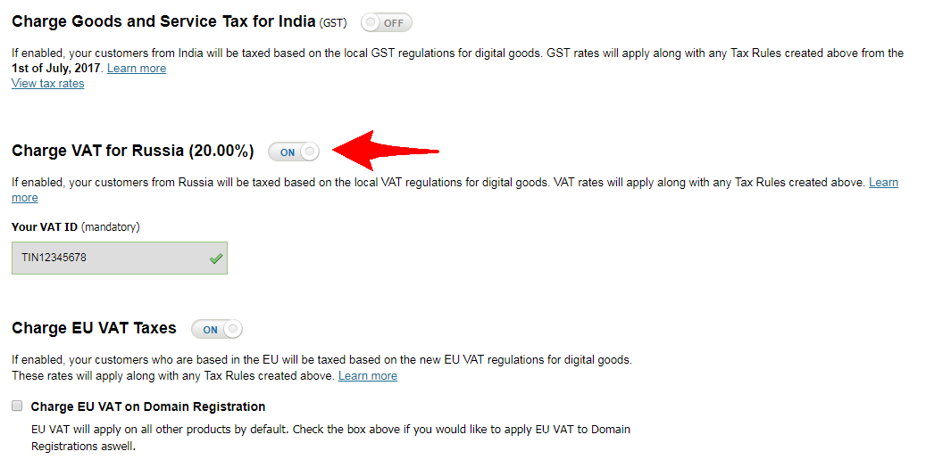 Click on the ON / OFF toggle next to Charge VAT for Russia to disable VAT for Russia.